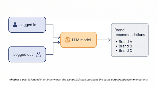 This is the core reason why an AI recommendation system is unlikely to change its brand outputs based on whether a user happens to be logged in. The model’s underlying knowledge, the weights built up during training, does not update between sessions. A logged-in user might get a slightly more structured or contextualised response. But the brand hierarchy the model has learned from training data is not going to shift based on session state.