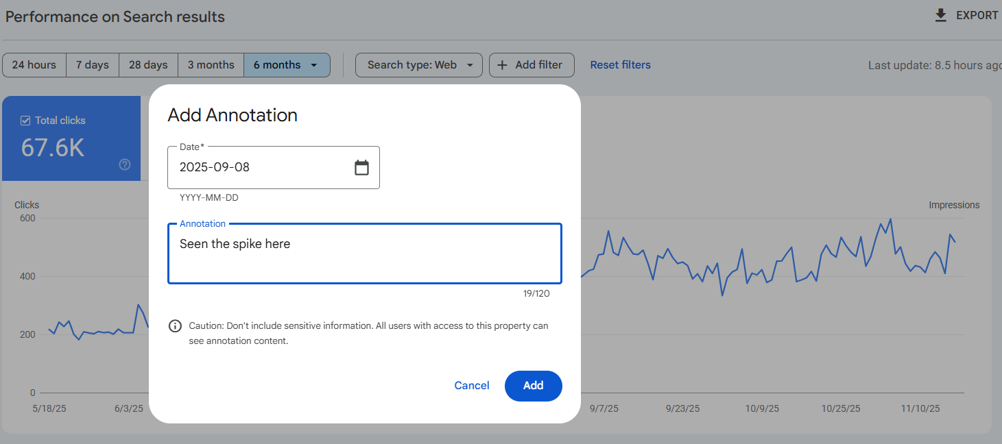 In its announcement, Google said: “This feature is designed to empower you to add your own contextual notes directly to your performance charts. Think of it as a personal notebook for your Search data.”